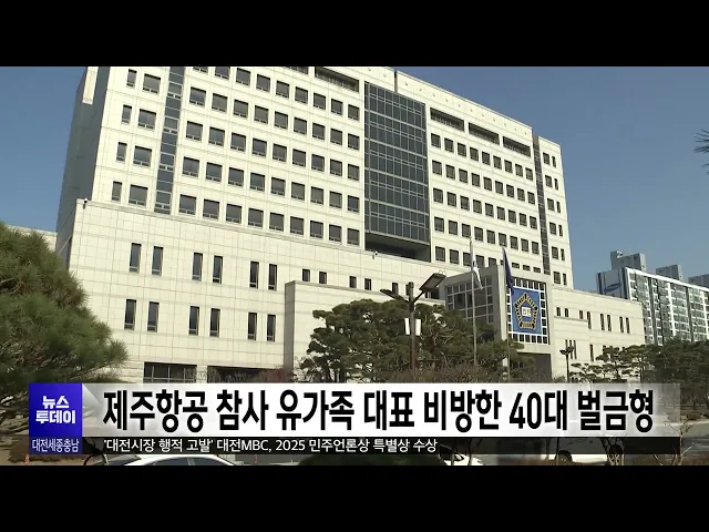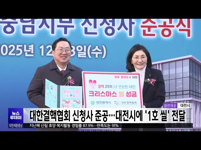 뉴스투데이 뉴스데스크뉴스투데이뉴스데스크 VOD(전체 다시보기)뉴스투데이 VOD(전체 다시보기)유튜브뉴스페이스북 뉴스카카오톡 뉴스인스타그램 뉴스 prev 2025.12.4 - 목요일 next [리포트]'사과' 없는 국민의힘⋯"국힘당은 해산하라" ◀ 앵 커 ▶12.3 내란 사태 1년을 맞아 국민의힘 국회의원 25명이 비상계엄에 사과했지만, 지역 국회의원들은 단 한 명도 없었습니다.오히려 보령서천 지역구의 장동혁당대표는, 의회 폭거에 맞서기 위한계... 문은선 [리포트]"다시 광장으로"⋯'내란 청산' 남은 과제를 위해 ◀ 앵 커 ▶12·3 불법 비상계엄 사태 1년을 맞은 어제, 영하권의 강추위에도,많은 시민들이 다시 거리로 나왔습니다.빛의 혁명으로 현직 대통령의 파면을이끌었지만, 내란에 대한 책임 규명은지지부진하다는... 이혜현 제주항공 참사 유가족 대표 비방한 40대 벌금형 대전지법 형사10단독 장진영 부장판사는, 179명이 숨진 제주항공여객기 참사 유가족 대표를 향해,허위 댓글을 게시한 혐의로 기소된40대에게, 벌금 7백만 원을 선고했습니다.피고인은 참사 직후인 지난 1... 김광연 한화 류현진 등 6명 WBC 대비 1차 캠프 합류 프로야구 한화이글스의 류현진과정우주, 문현빈 등 선수 6명이, 내년 월드베이스볼클래식을 앞두고1차 훈련에 참가할 국가대표팀명단에 뽑혔습니다.한화는 투수 류현진과 문동주, 정우주와포수 최재훈, 내... 이승섭 폰세·와이스, 나란히 미국 메이저리그 진출 눈앞 올 시즌 프로야구 한화이글스의한국시리즈 진출을 이끈 외국인투수 코디 폰세와 라이언 와이스가,나란히 미국 메이저리그에 진출할 것으로 보입니다.메이저리그 홈페이지 등 현지 매체는와이스가 휴스턴 ... 이승섭 [리포트]금강수목원은 애물단지?..민간 매각 가능성에 '반발' ◀ 앵 커 ▶중부권에서 가장 큰 규모인 금강수목원이, 이렇다 할 활용 방안을찾지 못하고 방치돼, 애물단지 신세로 전락하고 있습니다.충남도가, 국가 자산으로 넘기지 못하면 민간에 매각할 수 있다고밝히... 이승섭 대한결핵협회 신청사 준공..대전시에 '1호 씰' 전달 대한결핵협회 대전세종충남지부신청사가, 지상 5층 규모로 대전 선화동에 준공됐습니다.신청사에는 결핵협회 부설 의료기관인 대전 복십자의원도 확장 이전해지역민들의 의료 접근성을 높일 전망입니다.한... 김윤미 충남도립파크골프장 내년 3월 첫 삽 108홀 규모의 충남도립파크골프장이,청양에서 내년 첫 삽을 뜨고 내후년 6월부터 운영됩니다.충남도는 금강유역환경청과 환경영향평가 협의를 마무리하고, 내년 3월 착공을 목표로 각종 심의 등후속 절차... 최기웅 '2025 대한민국 정부혁신 박람회' 개막 행정안전부가 중앙 정부와지방자치단체, 민간 기업 등 157개기관의 혁신 우수 사례를 공유하는'대한민국 정부혁신 박람회'가,어제 충북 청주 오스코에서 개막해사흘 동안 열립니다.이번 박람회는 행복한 ... 이승섭 [리포트]'계룡산 영하 13도' 강추위⋯대전에도 첫눈 ◀ 앵 커 ▶어제 계룡산 기온이 영하 13도까지내려가는 등, 올겨울 들어 가장 추운 날씨가 기승을 부렸습니다.충남 서해안을 중심으로 눈이내리면서 대전에서도 첫눈이관측됐는데, 이번 강추위는 오늘 절정... 김성국 대전·충남 학교 비정규직 총파업..급식·돌봄 차질 예상 급식과 돌봄을 담당하는 대전과 충남학교 비정규직 노동자들이 오늘 하루 총파업을 예고해,일선학교의 급식과 돌봄 차질이 예상됩니다.대전에서는 141개 학교에서 600여 명,충남에서도 유치원 포함 268곳... 이교선 천안시, 출생축하금 최대 1천만 원으로 인상 천안시가 이달 중순부터 출산 가정의 양육비 부담을 줄이기위해, 출생축하금을 최대 1천만 원으로 인상합니다.시는 그동안 출산 자녀 수에 따라첫째 30만 원, 둘째 50만 원, 셋째 이상 1백만 원씩 지원하... 이승섭 카이스트 "첨가제가 전기차 배터리 성능 떨어뜨려" 전기자동차 배터리 안정성을 높이는첨가제인 '석시노트릴'이, 일부 배터리에서는, 성능 저하를 일으키는원인이라는 연구 결과가 나왔습니다.카이스트 연구팀은 '석시노트릴'이 리튬 코발트 산화물 배터리... 고병권 대청호 회남수역 조류경보 해제⋯추동·문의수역 '관심' 유지 어제 오후 3시를 기해 대청호 회남수역에 내려졌던 조류경보가 해제됐습니다.금강유역환경청은 유해 남조류 세포 수가 두 차례 연속 관심 단계 기준을 밑돌고,수온이 낮아져 조류 성장이 어려워진 영향이... 김광연 대전 호남고속도 지선 확장 내년 본격화⋯기본설계비 23억 반영 국회에서 기본설계비 예산 23억 원을 증액함에 따라, 대전의 숙원 중 하나인 호남고속도로 지선 확장사업이, 내년부터 본격 추진됩니다.이 사업은 호남고속도로 지선 서대전분기점~회덕분기점 구간 18.6km... 문은선