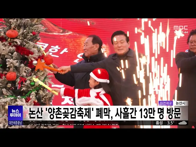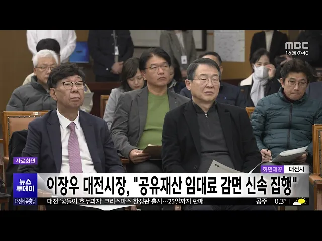 뉴스투데이 뉴스데스크뉴스투데이뉴스데스크 VOD(전체 다시보기)뉴스투데이 VOD(전체 다시보기)유튜브뉴스페이스북 뉴스카카오톡 뉴스인스타그램 뉴스 prev 2025.12.16 - 화요일 next [리포트]대통령 세종집무실 속도⋯"착공 앞당길 것" 안녕하십니까 12월 16일 화요일뉴스투데이 대전세종충남입니다.◀ 앵 커 ▶이재명 대통령이대통령 세종집무실의 건립을서두르라고 주문하면서 행정수도 조성의 속도가 빨라지고 있습니다.행정중심 복합도시 ... 이승섭 세종시, 정치권 "대통령 세종집무실 건립 의지" 환영 세종시가 논평을 내고 이재명 대통령이 대통령 세종집무실의조속한 건립을 주문한 건행정수도 완성을 향한 국정 운영 최고 책임자의확고한 의지라며 환영했습니다.시는 ‘행정수도 완성’이라는 정치적 선언... 이승섭 공공기관 2차 이전 내년 발표⋯대전·충남 대응 본격화 정부가 공공기관 2차 지방 이전 계획을 내년에공식 발표하고, 2027년부터 즉시 이전에 착수하겠다고 밝히면서 대전시와 충남도의 대응이 본격화하고 있습니다.이에 따라 대전시는 지난달 2차 공공기관 이... 김지훈 충남도, 농어촌 기본소득 도비 부담액 지원 충남도가, 청양군민에게 지급될농어촌 기본소득 중 30%에 해당하는 도비 부담액을지원하기로 결정했습니다.농어촌 기본소득은 국회 예산결산특별위원회 심의 과정에서 지방비 부담 비율 60% 중 도비 30%를... 최기웅 [리포트]"갇히면 끝?" 재난방송 '먹통' 터널, 충남 가장 열악 ◀ 앵 커 ▶지난주 내린 폭설로 수도권 터널 곳곳에 차량 수십 대가 고립되는 아찔한 상황,보셨을 겁니다.이런 재난 상황에서는 차량의 라디오가 외부와 연결되는 중요한 수단인데요. 하지만 우리 지역 터널... 이혜현 '신계룡-북천안 송전선로' 세종 장군면 주민 백지화 촉구 집회 세종시 장군면 주민들이 세종시청에서 집회를 열고,마을을 지나는 신 계룡-북 천안 송전선로 건설의백지화를 촉구했습니다.주민들은 "송전선로 건설 사업이국책사업이라는 이유로 주민 설명회 한 번 없이 ... 이승섭 '16명 사상' 운전자 내일 송치⋯약물 운전 혐의도 적용 지난 달 16명의 사상자가 발생한9중 추돌 사고를 낸 40대 테슬라 운전자에게약물 운전 혐의도 적용됐습니다.대전 유성경찰서는 "직접적인 사고 원인은운전자 질병에 의한 쇼크로 보이지만, 국과수 감정 결... 김광연 홍성에서 소나무재선충병⋯반출 금지 3만㏊로 확대 홍성군 서부면에서 소나무재선충병 감염목 9 그루가 추가 확인됐습니다.홍성군은 기존 발생지에서 5km 이상 떨어진곳에서 다시 소나무재선충병이 발생했다며, 관내 10개 읍·면 3만 ha에서 소나무 반출이금... 김지훈 [리포트]한화 김서현 "내년에도 가을야구" ◀ 앵 커 ▶프로야구 한화이글스의마무리 투수 김서현 선수를 대전 MBC가 단독 인터뷰했습니다. 마치 롤러코스터 같은 한 해를 보내며,팬들을 웃고 울린 김서현 선수는아쉬움 가득한 2025시즌을 되돌아봤는... 이승섭 이장우 대전시장, "소상공인 신속 지원" 이장우 대전시장이 소상공인과 중소기업을 대상으로 진행하는 공유재산 임대료 감면과 관련해신속 집행을 주문했습니다.이 시장은 어제 열린 주간업무회의에서 "정책의 실효성을 높일 수 있도록 적극 홍보... 박선진 대전 상장기업 시총 88조 돌파⋯코스닥 톱10 4곳 대전 지역 상장기업의 시가총액이 연일 최고치를 경신하며88조를 돌파했습니다.대전테크노파크에 따르면 지난달 기준 대전 상장기업 67곳의 시가총액은 88조 4천억 원으로, 지난 10월에 이어 두 달 연속 ... 김지훈 대전 초등학교 다음 달 5~6일 예비소집 실시 대전시교육청이 2026학년도 초등학교 취학 예정 아동의소재와 안전 확인 등을 위해다음 달 5일과 6일 이틀 동안 신입생 예비소집을 진행합니다.내년도 취학 대상자 보호자는 예비소집 당일 반드시 아이와 ... 김지훈 세종시의회, 세종시 보통교부세 개선 촉구 결의안 통과 세종시의회가 어제 제102회 정례회4차 본회의를 열어세종시와 세종시교육청의내년도 예산안을 포함한 8개 안건을 처리하고올해 마지막 회기를 마쳤습니다.시의회는 세종시 보통교부세 산정 방식을개선하고... 이승섭 [리포트]"백종원 없이 홀로서기"⋯지역 축제 성적은? ◀ 앵 커 ▶과거 홍성과 예산군 등 일부 지자체들은백종원 더본코리아 대표와 협업을 통해 지역 축제를 개최해 성공을 거뒀는데요. 백 대표를 둘러싼 논란이 이어지면서 올해 축제는 지자체의 자체 역량만으... 최기웅 논산 '양촌곶감축제' 폐막, 사흘간 13만 명 방문 논산시 양촌리 체육공원 일대에서 열린 논산 양촌 곶감축제에 사흘간 13만 명이 다녀간 것으로 집계됐습니다.시는 곶감으로 장식한 대형 크리스마스트리 등 크리스마스와 곶감을 결합한 이색적인 콘텐츠가... 박선진 대전 '꿈돌이 호두과자' 크리스마스 한정판 출시 대전시가 '꿈돌이 호두과자' 크리스마스 기념 특별 한정판을 출시해 오는 25일까지 중구 호두과자제작소에서 판매합니다.이번 한정판은 젊은 세대의 취향을 반영해 '소금앙버터' 맛을 새롭게 선보이며, 산... 김지훈