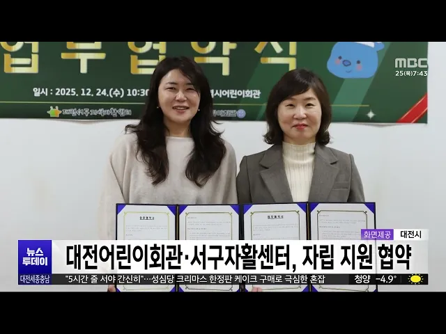 뉴스투데이 뉴스데스크뉴스투데이뉴스데스크 VOD(전체 다시보기)뉴스투데이 VOD(전체 다시보기)유튜브뉴스페이스북 뉴스카카오톡 뉴스인스타그램 뉴스 prev 2025.12.25 - 목요일 next [리포트]대전 아파트 재건축 바람⋯"주민들 동의해야" ◀ 앵 커 ▶여러분 안녕하십니까 뉴스투데이대전세종충남입니다.대전의 대표적인 노후 아파트 밀집 지역인 둔산동과 전민동에서,재건축 논의가 본격화되고 있습니다.둔산에선 노후계획도시 선도지구를겨냥해... 이교선 "KTX로 논산훈련소까지"⋯2034년까지 KTX 호남선 고속화 오는 2034년부터 예비 장병과 가족들이, KTX를 타고 논산육군훈련소까지 갈 수 있을 전망입니다.국토교통부는 오는 2029년부터 2034년까지 9천2백억 원을 투입해 호남선 대전 가수원역에서 논산역 구간의... 김지훈 [리포트] '행정통합' 주도권 경쟁⋯"수정하면 충분" ◀ 앵 커 ▶대전·충남 행정통합이 급물살을타면서, 주도권을 놓고 치열한 경쟁이펼치지고 있습니다.민주당 충청특위가 첫 회의를 열고, 통합 특별시에 서울과 제주 수준의 자치권과 재정 분권을 부여하는특... 최기웅 대전참여연대, 행정통합 추진 민주당 의원 비판 대전 시민사회가, 최근 급물살을타고 있는 대전충남 행정통합 논의에대한 지역 더불어민주당 국회의원들의 태도 변화를, 강하게 질타했습니다.대전참여자치시민연대는 논평을 통해"그동안 행정통합 추진에... 박선진 민주당 세종시당 '통일교 접촉 의혹' 최민호 세종시장 해명 요구 더불어민주당 세종시당이,지난 2022년 3월, 국민의힘 세종시당위원장이었던 최민호 세종시장이,통일교 측으로부터 후원금과 정책 제안서를 받았다는 언론 보도와 관련해,해명을 요구했습니다.한 중앙 일간... 이승섭 [리포트] "충남에 돈이 몰린다"⋯40조 투자 유치 실체는? ◀ 앵 커 ▶각종 지역 의제에 대한 참된 사실이무엇인지 찾는 팩트체크 기획보도'뉴스참' 순서입니다.김태흠 지사가 이끄는 민선 8기 충청남도는, 올해 체결한 투자 협약이40조 원을 돌파했다고 밝혔는데요.... 최기웅 충남 경제 규모 150조⋯7년 만에 4위로 하락 충남의 경제 규모가, 7년 만에 전국 3위에서 4위로 떨어졌습니다.국가데이터처의 2024년 지역소득 통계에 따르면충남의 지역내총생산은 150조 7천억 원으로 경기, 서울, 경남에 이어 4위로 집계됐습니다.... 김지훈 충남 여성농업인 해외연수 '70세 초과 배제'⋯인권위 "차별" 충청남도가 운영하는 여성농업인해외연수 사업에서 지원 대상을'20살 이상 70살 이하'로 한정한 것은,나이를 이유로 한 차별에 해당한다는국가인권위원회 판단이 나왔습니다.인권위는 "최근 충남도지사에... 김지훈 [리포트]"5시간 넘는 기다림도 추억"⋯크리스마스 맞은 성심당 북새통 ◀ 앵 커 ▶크리스마스를 하루 앞둔 어제,대전은 그야말로 '인산인해'를 이뤘습니다.일명 '가성비 케이크'로 소문이 난 성심당을 찾아, 전국 각지에서인파가 몰린 건데요.대기 시간만 5시간을 훌쩍 넘겼지만... 이혜현 한화이글스, 외국인 투수 오웬 화이트 영입 프로야구 한화이글스가, 새로운 외국인 투수로 오른손 투수오웬 화이트를 총액 백만 달러에 영입했습니다.화이트는 평균 시속 150km에 가까운 빠른 공과다양한 변화구를 구사하는 선발 투수로미국 메이저... 이승섭 대전어린이회관-서구자활센터, 취약계층 자립 지원 협약 대전시 어린이회관과 대전 서구지역자활센터가 업무협약을 맺고,지역 대표 캐릭터인 꿈돌이를 활용한호두과자 판매사업을 통해,취약계층 자립을 돕습니다.이번 협약으로 지역자활센터가 직접 생산한 호두... 박선진