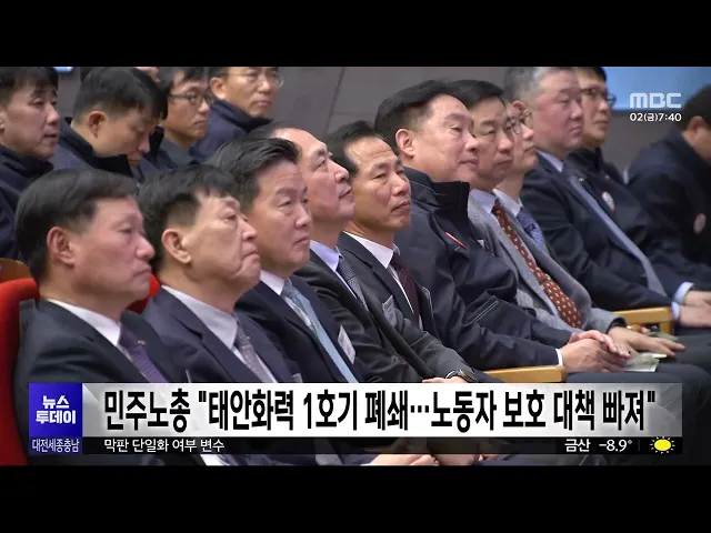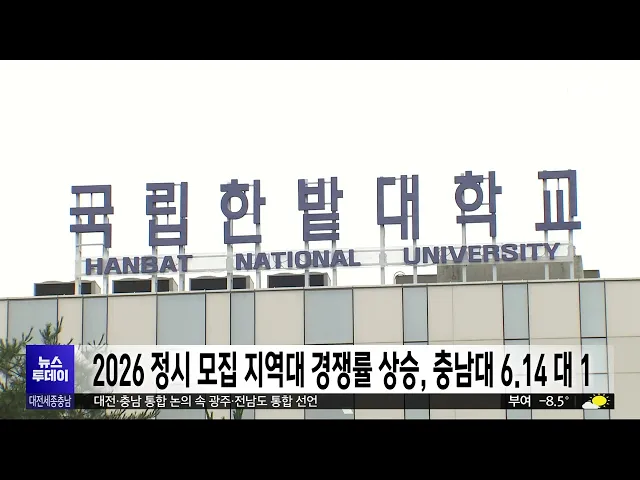 뉴스투데이 뉴스데스크뉴스투데이뉴스데스크 VOD(전체 다시보기)뉴스투데이 VOD(전체 다시보기)유튜브뉴스페이스북 뉴스카카오톡 뉴스인스타그램 뉴스정정 및 반론보도 모음 prev 2026.1.2 - 금요일 next [리포트]붉은 말의 해, 힘찬 새출발 ◀ 앵 커 ▶붉은 말의 해, 병오년 2026년 새해 첫날.어제 하루, 어디서 어떻게 보내셨습니까?새 출발을 다짐한 시민들이해맞이부터 맨몸 마라톤까지,도심과 산, 바다 곳곳에서 새해를 열었습니다.새해 첫날... 이혜현 대전-충남 통합 논의 속 광주-전남 통합선언문 발표로 가세 대전·충남 행정통합 논의가 급물살을 타면서, 다른 지역도 통합 추진에 나서고 있습니다.정부는 대전·충남 통합을 지역 균형 발전 전략의 핵심 사례로 삼아 올 7월 출범을 목표로 절차를 서두르고 있는데,... 이교선 아파트값 세종 상승, 대전·충남 하락 전환 세종의 아파트값은 오름세를 이어간 반면, 대전과 충남은 다시 하락세로 돌아섰습니다.한국부동산원이 발표한 12월 5주 시도별 아파트 매매가격 동향에 따르면, 세종은 0.08% 올라 8주 연속 상승했습니다.... 이교선 새해 첫 출근길 '영하 10도' 강추위 충남 6개 시군에 한파주의보가 이어진 가운데새해 첫 출근길에 영하 10도 안팎의강추위가 기승을 부리고 있습니다.보령과 서천 등 서해안에는 일부 눈이 내린 가운데, 오늘 아침 기온은 대전,세종 영하 12... 이혜현 [리포트]'행정통합' 급부상⋯"초대 통합시장 누가 뛰나?" ◀ 앵 커 ▶오는 6월 열릴 지방선거의 최대 관심은대전·충남 행정통합일 텐데요.지방선거를 불과 6개월 앞둔 시점에통합 논의가 급물살을 타면서 과연 통합시장 선출이 가능한 건지관심이 커지고 있습니다.... 박선진 2026 정시모집 마감, 지역 주요 대학 경쟁률 상승 2026학년도 정시모집 원서접수가 마감된 가운데 대전과 천안·아산 주요 대학들의 경쟁률이 전반적으로 상승했습니다.대전에서는 충남대가 6.14대 1로 최근 10년 최고치를 기록했고,한밭대 7.99대 1, 우송... 이교선 GM부품물류지회 “노조 설립 뒤 집단해고…고용승계 요구” 한국GM 세종물류센터 하청 노동자들로 구성된 금속노조 GM부품물류지회가 집단해고 사태에 대한 조속한 해결을 촉구했습니다.지회는 입장문에서 20년 동안 이어진 고용승계가 지난해 12월 31일을 끝으로 ... 이교선 태안화력 1호기 폐쇄, "탈석탄 서두르면서 노동자 보호 없다" 비판 태안석탄화력발전소 1호기가 가동을종료한 가운데, 실업 노동자들을 위한고용 대책이 없다는 비판이 나왔습니다.민주노총 공공운수노조는 성명을 통해"정부가 탈석탄의 속도는 높이면서도고용 문제에는 무... 이혜현 [리포트]'행정수도 완성' 세종시장⋯예측불허 3파전 ◀ 앵 커 ▶6월 지방선거에서 세종시는 '행정수도 완성'을 놓고 어느 지역보다 치열한 선거전을 예고하고 있습니다.수성을 꿈꾸는 국민의힘과탈환을 노리는 더불어민주당,지난 총선의 여세를 이어가려는 조... 이승섭 대전 중소기업 91.5% 올해 경영환경 "정체·악화" 전망 대전지역 중소기업 대다수가올해 경영 상황 전망을 "정체 또는 악화"로예측하는 것으로 조사됐습니다.중소기업중앙회 대전세종지역본부가 중소기업 306곳에 ‘2026년 대전지역 중소기업 경영환경 전망 조사... 이교선 '택시 기사 폭행' 카이스트 교수, 벌금형 확정 술에 취해 택시 기사와 경찰을 폭행한 혐의로재판에 넘겨진 60대 카이스트 교수에게 벌금 3백만 원이 확정됐습니다.대전지법 형사항소 2-1부는 피고인이 초범이고피해자들과 합의가 이뤄진 점 등을 고려해... 이혜현 부여 굿뜨래페이 충전 한도 150만 원, 할인 10% 부여군이 새해를 맞아지역화폐 ‘굿뜨래페이’의 한 달 충전 한도를 150만 원으로 늘리고, 10%의 충전 인센티브를 적용합니다.지역화폐 한도 확대는 그동안 지역 경제 효과를 반영한 조치로, 명절과 지역 축... 이교선