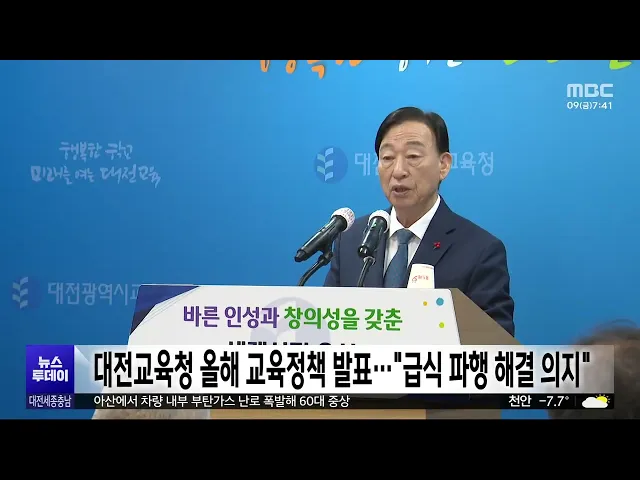 뉴스투데이 뉴스데스크뉴스투데이뉴스데스크 VOD(전체 다시보기)뉴스투데이 VOD(전체 다시보기)유튜브뉴스페이스북 뉴스카카오톡 뉴스인스타그램 뉴스정정 및 반론보도 모음 prev 2026.1.9 - 금요일 next [리포트]서울 쓰레기가 충청으로⋯"충청권이 쓰레기장이냐?" ◀ 앵 커 ▶여러분 안녕하십니까 뉴스투데이대전세종충남입니다.올해부터 수도권 생활폐기물을 땅에 묻는 직매립이 금지됐습니다.수년 전부터 예고됐지만, 서울과경기도의 소각시설은 늘어나지 않았고, 결국... 이승섭 [리포트]수도권 위한 전기는 당연?⋯"송전탑 설치 불가" ◀ 앵 커 ▶넘쳐나는 수도권 쓰레기가 지역으로밀려오는 동시에, 수도권을 위한 전력을 보낸다며, 대전과 세종, 충남 곳곳에는 송전탑 건설이추진되고 있습니다.이쯤 되니, 충청권이 수도권에 전기를보내주... 김성국 교육공무직-교육청 교섭 결렬⋯신학기 총파업 가능성 민주노총 공공운수노조 교육공무 직본부 대전지부가 대전교육청 앞에서 기자회견을 열어,집중교섭 결렬 책임을 규탄하고, 명절휴가비 정률제 도입을 촉구했습니다.노조는 "지난달 집중교섭 결렬의 책임은... 이교선 대전 마약사범 23.6% 외국인⋯1년 전보다 40% 증가 지난해 대전에서 마약류를 매매하거나 투약해 검거된 마약사범208명 가운데 49명인 23.6%가,외국인인 것으로 나타났습니다.이는 1년 전보다 약 40% 증가한 규모로,대부분 유학이나 취업 등을 이유로 장기 ... 이혜현 대전 보문산서 노란목도리담비 사체 발견⋯"생태 보전 정책 마련하라" 지난달 23일 대전 보문산 산책로에서 멸종위기 야생생물 2급인 노란목도리담비 사체가 발견돼,환경단체가 생태 보전 정책을촉구하고 나섰습니다.대전충남녹색연합은 논평을 내고"대전시가 보문산 개발 사... 이혜현 [리포트]통합특별시, 7월 1일 출범하나? ◀ 앵 커 ▶더불어민주당이 대전충남행정통합을 위한 시도당 차원의 특별위원회를 꾸리는 등, 오는 7월 통합시 출범을 위한 움직임이본격화하고 있는데요.공론화 과정과 교육 자치 훼손 등에대한 걱정의 목... 박선진 이은권 "통합은 속도 아닌 완성도 문제" 국민의힘 이은권 대전시당위원장이,속도전 양상을 보이는 대전충남 통합에 제동을 걸었습니다.이 위원장은 신년 기자회견에서"통합은 선언이 아니라 법과 제도의 문제로,가장 경계해야 할 건 지방선거 일... 문은선 이완섭 "서산·태안 통합 검토"⋯태안군수 '부정적' 대전·충남 통합이 급물살을 타고 있는 가운데, 홍성과 예산, 서산과 태안 등 기초자치단체간통합 논의도 재점화하고 있습니다.이완섭 서산시장은 언론인 간담회에서 "산업 중심 서산과 관광 중심 태안이 ... 최기웅 [리포트]'행정통합' 교육은 소외?⋯교육감 "원점 재검토" ◀ 앵 커 ▶속도를 내고 있는 대전·충남 행정통합. 하지만 지방자치의 또다른 축인 교육 자치는,소외되고 있다는 목소리가 커지고 있습니다.김지철 충남교육감은, "큰 방향에 공감하지만, 교육자치는 원점 ... 최기웅 대전교육청 올해 교육정책 발표⋯"급식 파행 해결 의지" 대전시교육청이 올해 교육정책으로,창의융합교육과 AI 기반의 미래교육 등을 추진합니다.설동호 교육감은 기자회견에서AI 중점학교 확대와 디지털 기반 수업 혁신,초등 저학년 기초학력 보장과 돌봄 강화 ... 이교선 KAIST, 난치성 뇌종양 시작점 최초 규명 젊은 성인에게 주로 발생하는 난치성 뇌종양인 돌연변이성 신경교종을, 조기에 발견하고 재발을 막을 수 있는 길이 열렸습니다.카이스트와 연세대 공동 연구진은난치성 뇌종양이 갑자기 생기는 것이 아니... 이혜현 생명연 "식품·화장품 속 나노 물질, 태아 뇌 발달 저해" 식품과 화장품 등에 널리 쓰이는'실리카 나노 물질'이, 태아의뇌 발달을 저해한다는 연구 결과가 나왔습니다.한국생명공학연구원은 실리카 나노 물질이뇌의 바탕이 되는 세포 증식을 억제하고,뇌 발달에 ... 이혜현 태안에 지난해 '역대 최다' 1천809만 명 방문 지난해 태안을 찾은 방문객이,역대 가장 많은 1천 809만 명으로집계됐습니다.이는 전년 대비 76만 명 늘어난 수치로, 여름철 해수욕장 방문객이 3년 연속 160만 명을 넘어섰고, 지난달에도 103만 명이 태... 최기웅 세종시, 지난해 고향사랑기부제 역대 최고액 모금 세종시가, 지난해 고향사랑기부제에서전년보다 51% 증가한 역대 최고액인 4억 5천여만 원을 모금했습니다.시는 지역 특산물인 배와 복숭아를 비롯해 한우와 한돈 등이 답례품으로 인기를 끌었고,다양한 홍... 이승섭 예산군, 임산부 진료 교통비·산후조리원 비용 지원 예산군이 올해부터, 임산부들의 산부인과 진료 교통비와 산후조리원 비용을 지원합니다.대상은 군에 주소를 둔 신생아와 산모가 있는 가정으로, 소득 수준과 관계없이 모든 임산부가 지원받을 수 있습니다... 최기웅 부여군, 100살 이상 장수 축하금 지급⋯굿뜨래페이 50만 원 부여군이 올해부터, 100살을 맞은 어르신들에게 장수 축하금을 지급합니다.지급 대상은 100살 이상 어르신으로, 지역화폐인 굿뜨래페이로 50만 원이 지급되며 군은 대상자들에게 사전에 우편으로 안내문을... 문은선