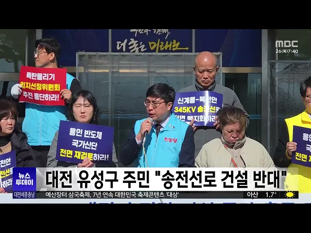 뉴스투데이 뉴스데스크뉴스투데이뉴스데스크 VOD(전체 다시보기)뉴스투데이 VOD(전체 다시보기)유튜브뉴스페이스북 뉴스카카오톡 뉴스인스타그램 뉴스정정 및 반론보도 모음 prev 2026.2.26 - 목요일 next 김민석 국무총리 "대통령 세종집무실·세종의사당 조기 건립" 김민석 국무총리가 정부세종청사에서열린 세종시 지원위원회에 참석해,"대통령 세종집무실과 국회 세종의사당이 조기에 건립될 수 있도록,실질적인 협업 체계를 갖추겠다"고 말했습니다.김민석 총리는 "정... 이승섭 [리포트]'통합 무산' 후폭풍⋯여야 '네 탓' 공방 ◀ 앵 커 ▶국회에서 충남대전 행정통합 특별법처리가 사실상 무산되면서,지역 정치권에 후폭풍이 거셉니다.여야 모두 상대방에게, 통합 무산의책임을 돌리는 데 힘을 쏟았는데요.석 달여 앞으로 다가온 지... 문은선 시민사회 "통합법 보류 아닌 폐기해야" 정부와 여당 주도의 행정통합에반대했던 시민사회는, 법안 처리가사실상 무산된 데 대해 환영하면서도,법안의 완전 폐기를 촉구했습니다.경제정의실천시민연합은 "개발 사업에 대한 국가 차원의 감시가사... 문은선 충남도, 서산 석유화학산업 고용안심망 구축 경기 침체로 어려움을 겪는 서산 대산 석유화학단지에서, 고용 안정 사업이 추진됩니다.고용노동부 주관 버팀이음 프로젝트로 추진되는 이 사업은 서산에 오는 노동자에게 6개월간 최대 300만 원의 장려금... 최기웅 태안국제원예치유박람회, 개막 두 달 앞으로..준비 순조 태안 국제원예 치유박람회조직위원회가, 박람회 개막을 두 달 앞둔 현재, 전시관 설치와 기업 유치 등 행사 준비를 순조롭게 진행하고 있다고 밝혔습니다.조직위는 어제 최종 준비상황보고회에서 박람회장... 이승섭 내포신도시 자율주행 버스 야간에도 주행 충남도가, 야간에도 내포신도시자율주행 순환버스를 운행합니다.도는 국토교통부 주관 '자율차 시범운행지구 서비스 지원사업' 공모에 선정됨에 따라 야간까지 자율주행 서비스를 확대해 대중교통 취약 시... 최기웅 [리포트]지방으로 떠넘긴 쓰레기.. "국가가 나서 책임져라" ◀ 앵 커 ▶지난달부터 수도권 생활 폐기물의 직매립이 금지된 이후, 수도권의일부 쓰레기는 지역으로 전가되고 있습니다.특히 충청권이 가장 큰 짐을 떠안게 되자, 지역 환경단체가,청와대로 찾아가 정부의... 전효정 '39억 탈세' 김정규 타이어뱅크 회장 파기환송심 첫 재판 대리점 명의를 위장해 수십억 원을탈세한 혐의로 기소된 김정규 타이어뱅크 회장이, 파기환송심 첫 재판에서, "대법원이 인정한면소 부분뿐 아니라, 추가로 면소 판결이 이뤄져야 한다"고 주장했습니다.김... 김성국 대전선관위, 교육감 선거 관련 허위사실 공표 등 5명 고발 대전시 선거관리위원회가 오는 6월,지방선거에 당선될 목적으로 현수막과 SNS 등에 허위 경력을게재해 공포한 혐의로, 대전시교육감선거 입후보예정자를 경찰에 고발했습니다.선관위는 또 출판기념회장 참... 문은선 선박 전복 사고 책임 피하려 임대차계약서 위조 선주 부부 항소심서 감형 대전지법 제2-2형사부가,지난 2024년 서산 고파도 인근 해상에서 선박 사고로 5명이 숨지자,책임을 피하려고 선박 임대차계약서를허위로 작성한 혐의로 기소된 선주의 항소심에서, 징역 4년을선고한 원심... 전효정 [리포트]우승 후보 대전.."녹색 머리로 염색하겠다" ◀ 앵 커 ▶이번 주말, K리그가 8개월간의 대장정을 시작합니다.지난해 준우승을 차지한대전하나시티즌은, 올 시즌 강력한 우승 후보로 꼽히는데요.대전 황선홍 감독은, "우승하면 녹색 머리로 염색하겠다"... 이승섭 공공디자인에 시민 아이디어 반영⋯공모전 개최 대전시가 공공디자인 분야 시정에 시민 아이디어를 반영하기 위해, 공모전을 개최합니다.공모전은 '머무는 도시, 대전'을 주제로 대전역 서광장 도시 비우기 사업과 트램 통과 구간 상징가로 특화경관 구... 김광연 재난으로 주택 잃은 주민 주거 복구 지원에 민·관 협력 대전시와 대전광역시 건축사회가 업무협약을 맺고, 재난으로주택을 잃은 주민의 주거 복구를 지원하는 데 힘을 모으기로 했습니다.두 기관은 재난 피해 주택의 설계와 감리 비용을 절반까지 감면하거나 건... 김광연 '대덕세무서 신설' 구민 9만여 명 서명부 국세청 등에 전달 대전 대덕구가, 대덕세무서신설을 촉구하는 구민 9만7천여 명으로부터 받은 주민 서명부를, 국세청과 행정안전부 등에전달했습니다.대덕구는 대규모 산업단지와 기업이 밀집해인구 대비 세수 기여도가 높... 김광연 대전 유성구 주민 "송전선로 건설 반대" 경기도 용인 반도체 국가산업단지를 조성하기 위한 송전선로 건설영향권에 포함된 대전 유성구주민들이 어제 대전 유성구청앞에서 기자회견을 열어, 유성구가송전선로 건설에 반대 입장을분명히 해야 한다... 이승섭 [리포트]고속도로 붕괴 1년⋯"심각한 트라우마" ◀ 앵 커 ▶10명의 사상자를 낸 세종안성고속도로 붕괴 사고가, 어제로 꼭 1년을 맞았습니다.사고 원인은 밝혀졌고, 관련자의 처벌 절차도 진행되고 있지만, 사고로 일상이 무너진 주민들의고통은 현재 진행... 김성국 서천 장항국가생태산단 2-2단계 준공 