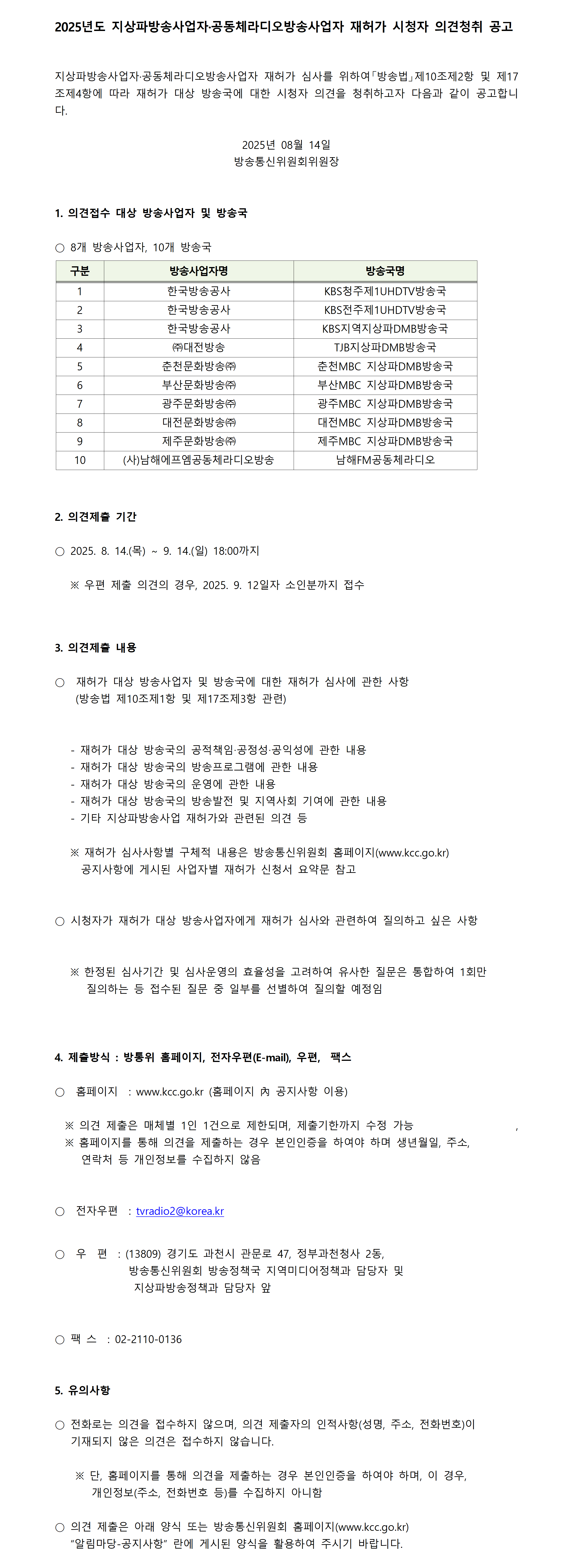 공지사항 2025년도 지상파방송사업자·공동체라디오방송사업자 재허가 시청자 의견청취 공고 등록일 : 2025-08-14 07:32 조회수 : 46 ※ 시청자의견서 양식 (다운로드) ※ 대전MBC 사업계획서 요약문 (다운로드) 수정 삭제 이전글 목록