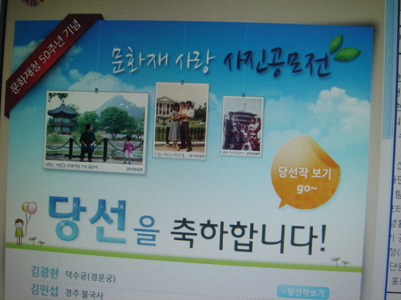 그제 모처럼 ‘빈집에 소’가 들어왔습니다. 그건 바로 문화재청이 실시한 <문화재 사랑 사진공모전>에서 당선이 된 때문이었지요. 등기우편으로 도착한 당선 축하 안내문의 속엔 5만 원권 쇼핑문화상품권이 석장이나 같이 들어있었습니다.