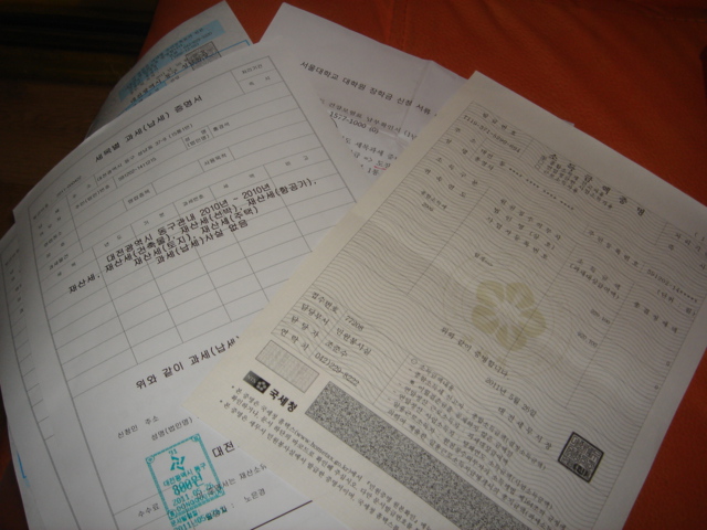 세무서를 나와 택시를 타고 이번엔 동사무소로 갔다. 주민등록 등본에 이어 <2010년도 세목별 과세(납세) 증명서>의 발급을 요청했다. 여전히 쥐뿔도 없이 사는 형국인지라 그 증명서에는 역시나 “대전광역시 동구 관내 2010년~2010년 재산세. 재산세(건축물), 재산세(항공기), 과세(납세) 사실 없음”이 명확하게 기록되어 도출되었다.