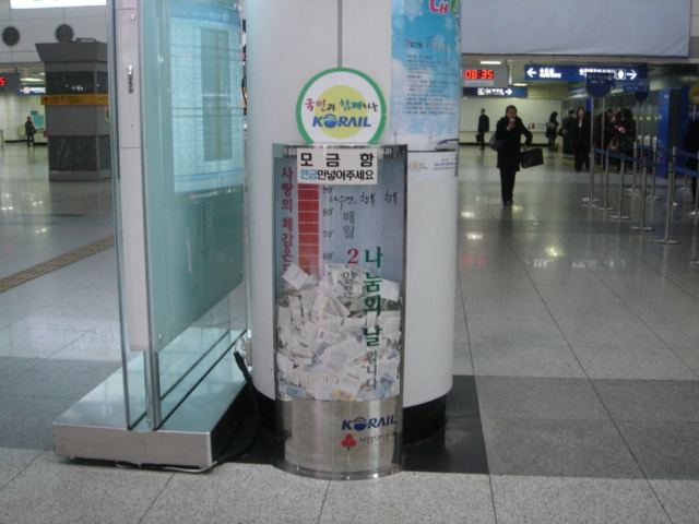 즐거운 오후2시 월 화 수 목 금 14시 05분 로컬방송 홈 코너소개 일반사연 [화]하하호호퀴즈 [목]즐2 편지쇼 일반사연 현금만 넣으라니까요! 조회수 : 268 대전역 대합실 안에 있는 ‘사랑의 모금함’이다. “현금만 넣어주세요”라고 써 있으나 승객들은 하나같이 각종의 영수증만 넣어두었다. 사랑의 열매가 인기 추락한 걸 모르는 바 아니지만 어쨌든 현금은 하나도 안 보여 마음이 덩달아 을씨년스러웠다. 수정 삭제 이전글 다음글 목록