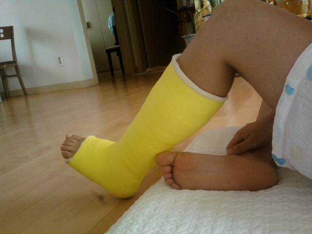 무릎까지 통 깁스를 하고 집에서만 쩔뚝 쩔뚝 걸어다니는