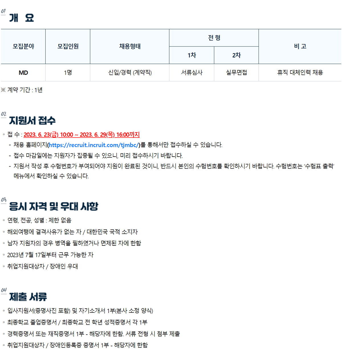 2023 대전MBC MD(계약직) 모집 안내 [마감] 등록일 : 2023-06-21 10:48
