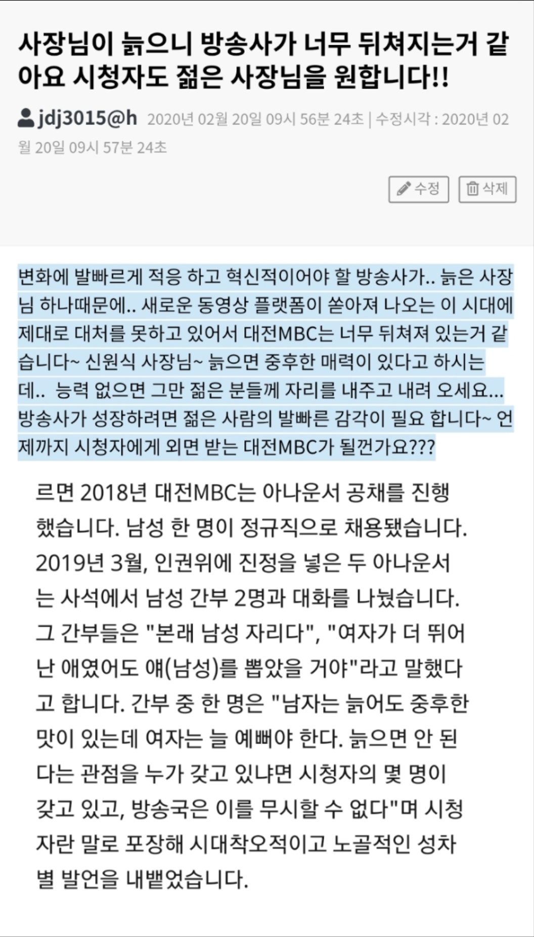 시청자의견 시청자 의견 사장님이 늙으니 방송사가 너무 뒤쳐지는거 같아요 시청자도 젊은 사장님을 원합니다!! 등록일 : 2020-03-09 11:09 조회수 : 128 여러분의 의견을 남겨주세요 ※ 댓글 작성시 상대방에 대한 배려와 책임을 담아 깨끗한 댓글 환경에 동참해 주세요. 0/2000 등록 수정 삭제 이전글 다음글 목록