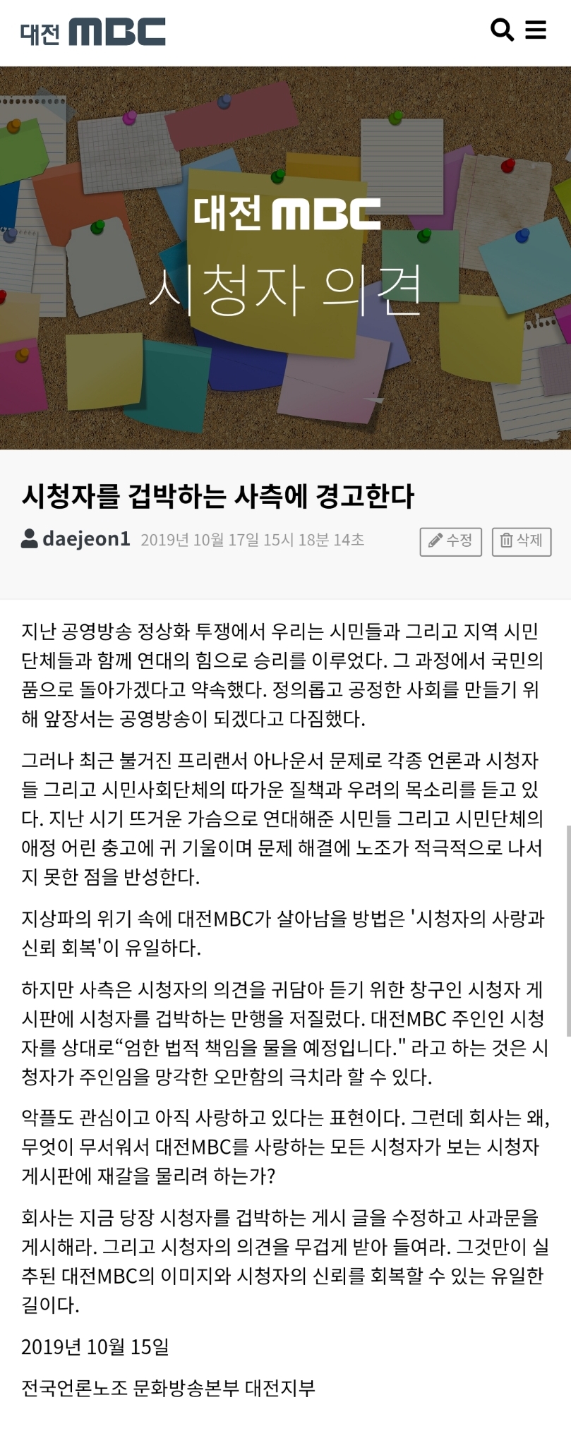 시청자의견 시청자 의견 신원식 사장님은 시청자를 협박하는 사람입니다~ 등록일 : 2020-03-09 20:22 조회수 : 192 여러분의 의견을 남겨주세요 ※ 댓글 작성시 상대방에 대한 배려와 책임을 담아 깨끗한 댓글 환경에 동참해 주세요. 0/2000 등록 수정 삭제 이전글 다음글 목록
