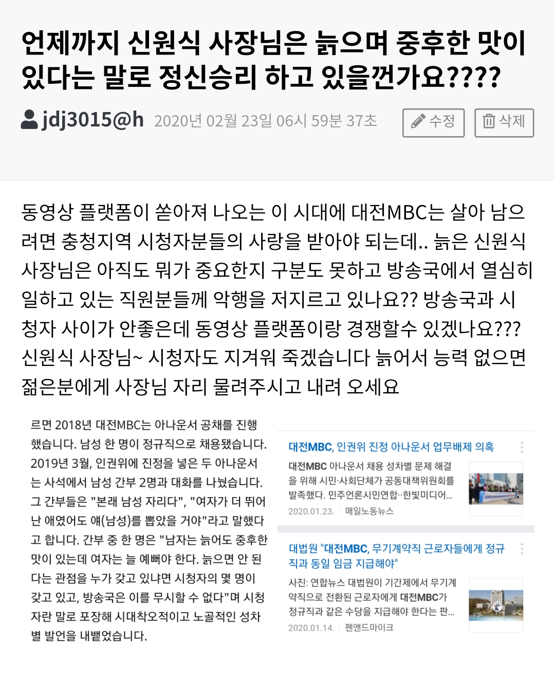 시청자의견 시청자 의견 언제까지 신원식 사장님은 늙으면 중후한 맛이 있다는 말로 정신승리 하고 있을껀가요?? 등록일 : 2020-02-24 12:59 조회수 : 144 여러분의 의견을 남겨주세요 ※ 댓글 작성시 상대방에 대한 배려와 책임을 담아 깨끗한 댓글 환경에 동참해 주세요. 0/2000 등록 수정 삭제 이전글 다음글 목록