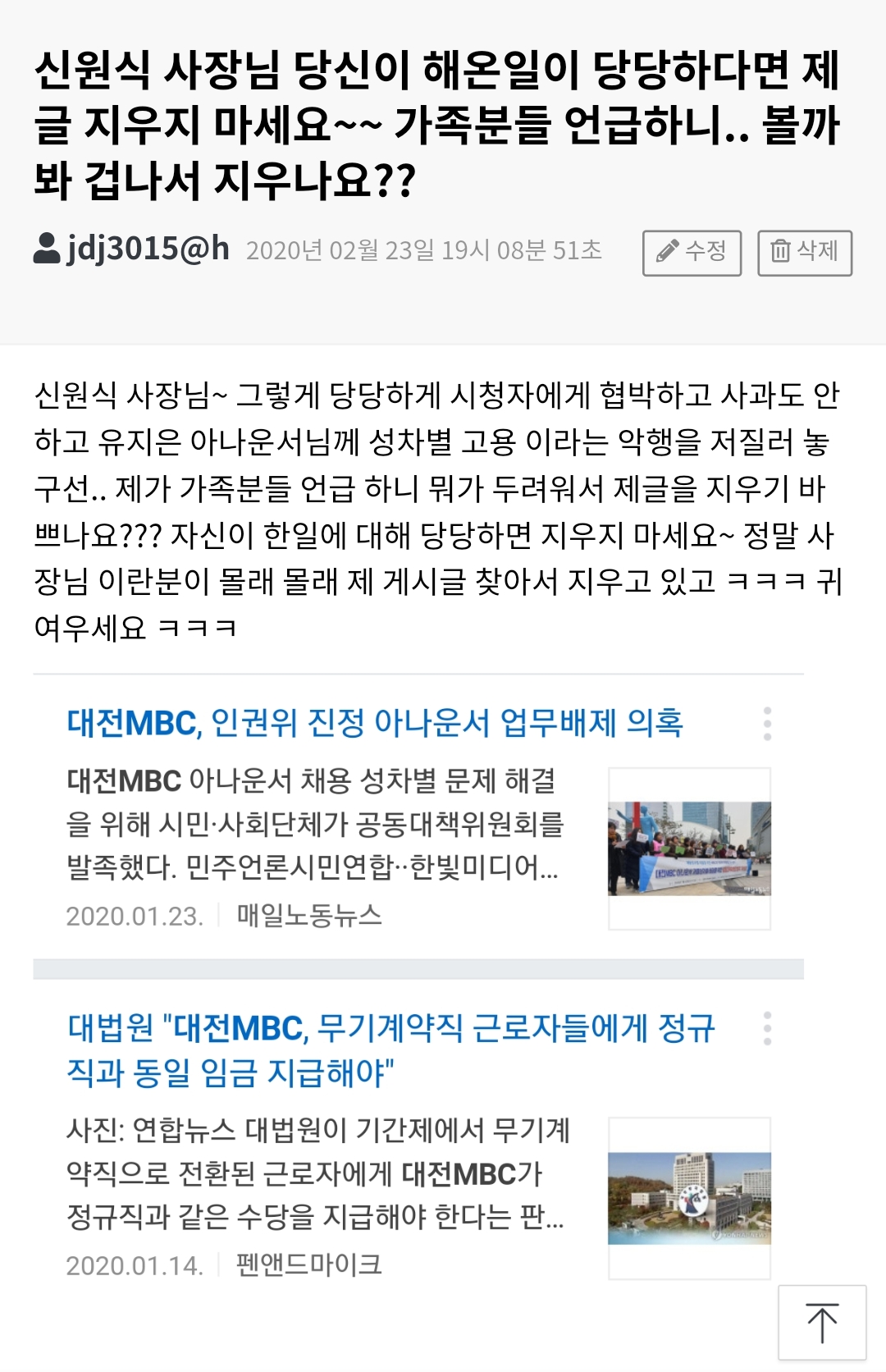 시청자의견 시청자 의견 신원식 사장님 당신이 해온일이 당당하다면 제글 지우지 마세요~~ 가족분들 언급하니.. 볼까봐 겁나서 지우나요?? 등록일 : 2020-02-24 13:01 조회수 : 174 여러분의 의견을 남겨주세요 ※ 댓글 작성시 상대방에 대한 배려와 책임을 담아 깨끗한 댓글 환경에 동참해 주세요. 0/2000 등록 수정 삭제 이전글 다음글 목록