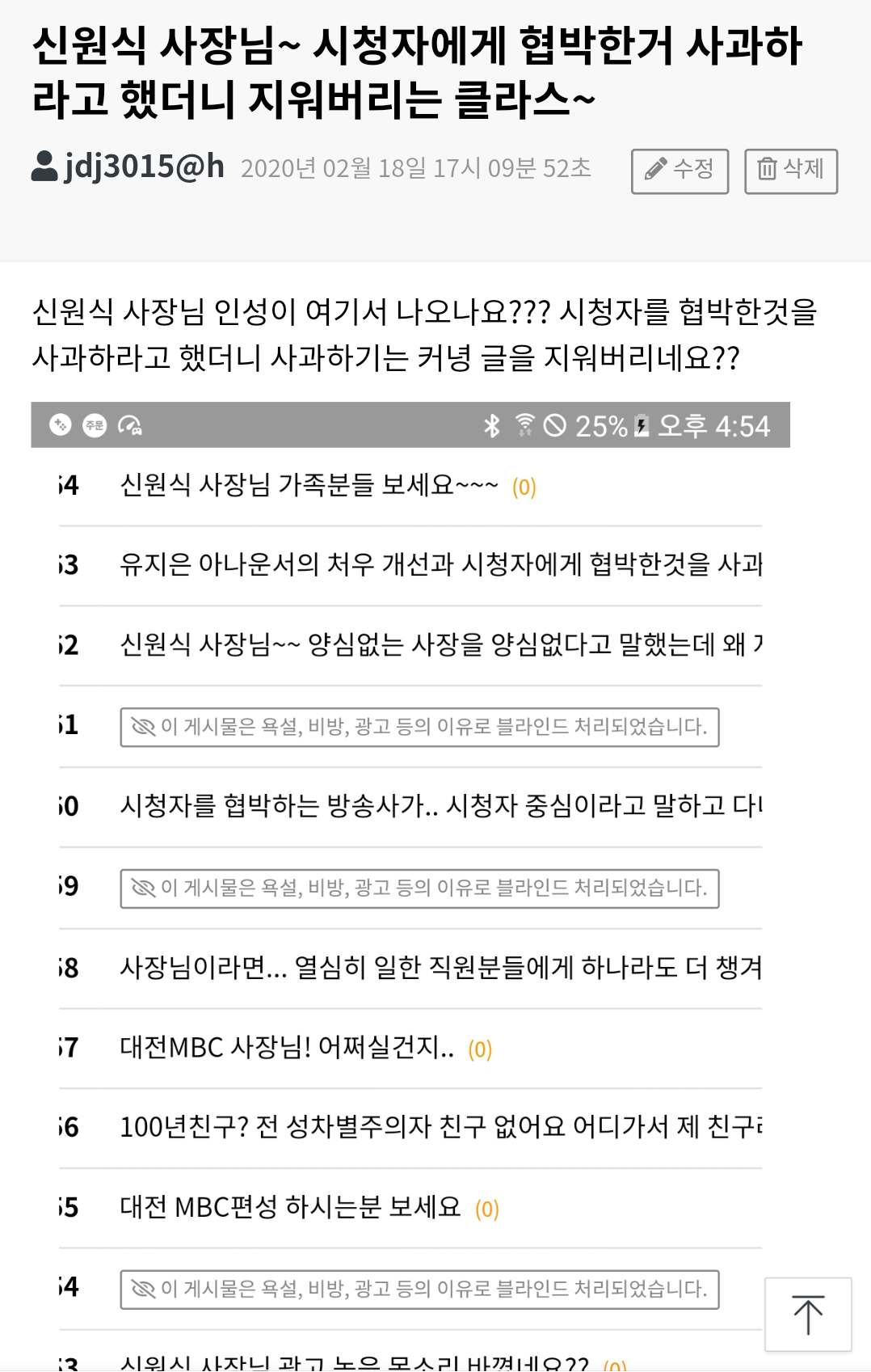 시청자가 대전MBC의 잘못된 점을 지적하면 받아드릴줄도 알고 시청자의 마음을 사로 잡을줄도 알아야 진정한 사장님이라는 리더가 되는겁니다... 신원식 사장님 처럼 사과하기는 커녕 숨기고 지우기 바쁜 사장님이 무슨 일을 하겠습니까???? 신원식 사장님 인성좀 배우세요 나이만 많다고 어른이 되는게 아닙니다