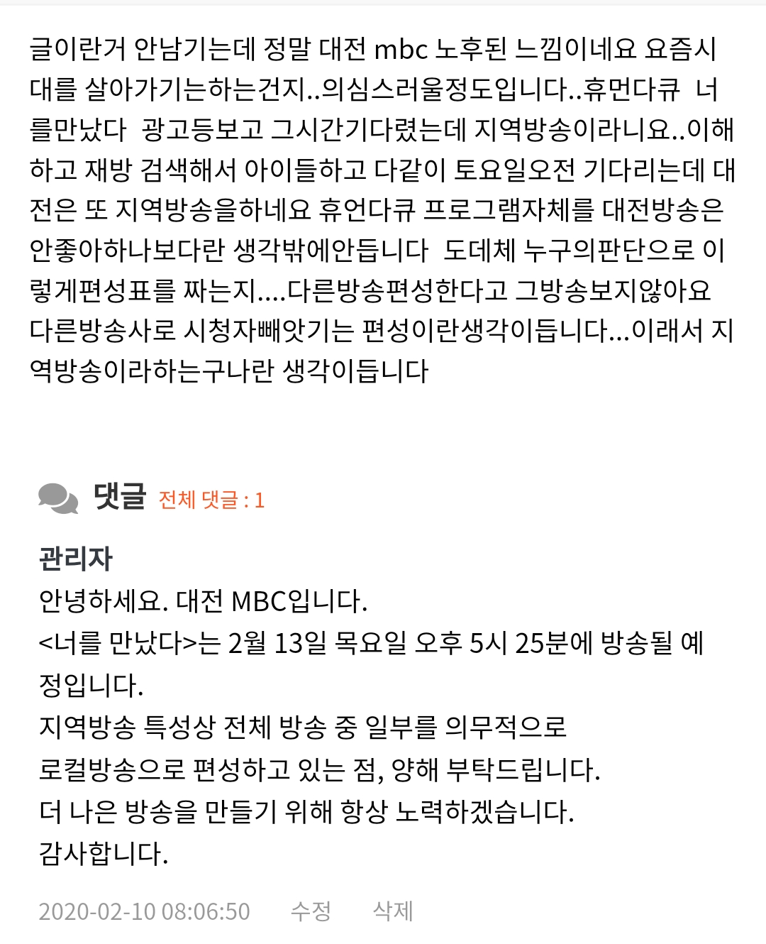 너를 만났다 프로그램 재방송 해달라고 요청한분들이 몇분 계시는데.. 재방송 한다고 새로 글을 올리셔야지. 한분의 글에 댓글만 달면 다른 분들은 재방송 하는지 어떻게 아나요??? 글 올리신분만 몰래 보라고.. 그분에게 배려 하신건가요?? 시청자 차별하는 것도 아니고... 신원식 사장님아 일좀 제대로 합시다