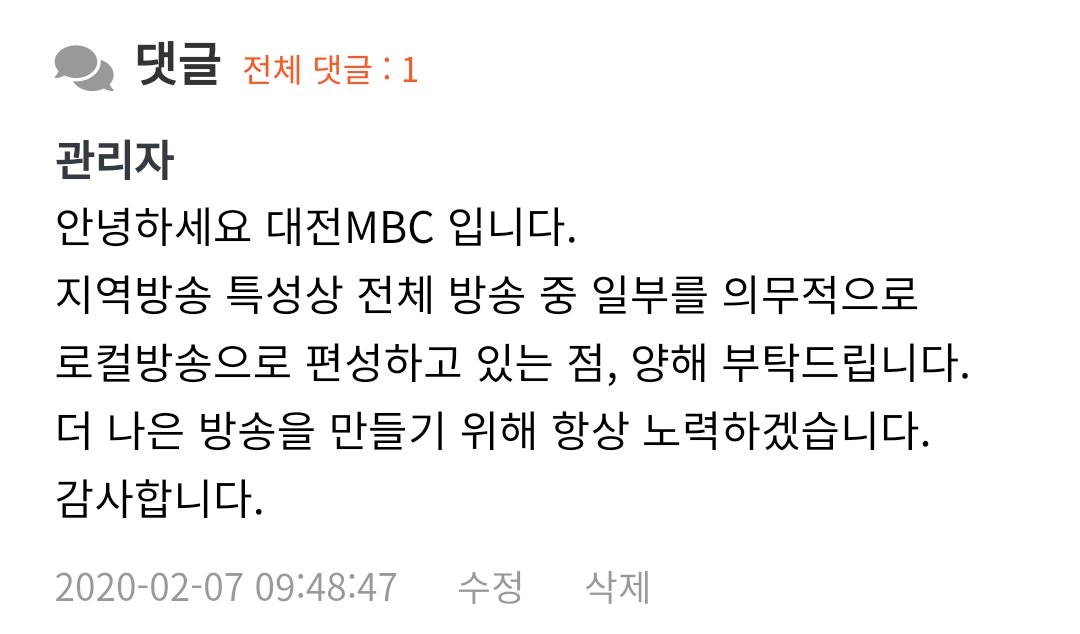 대전MBC 편성 어느분이 하시는지... 참 답이 없으시네요.... 등록일 : 2020-02-07 11:33