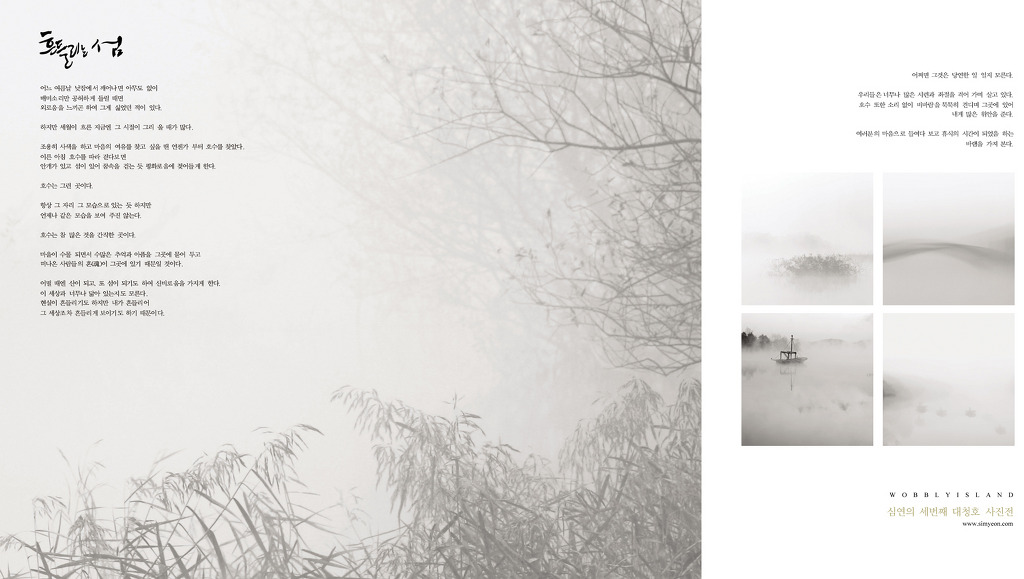 심연 엄경섭이 대청호에 이어 또다시 "흔들리는 섬" 이라는 주제로 3번째 개인전을 펼친다. 그의 사진은 언제나 그렇듯이 다분히 심상적이다. 사물을 읽는 시각이 시적이고 음악적이다. 그의 사진을 보고 있노라면 마치 구름이 바람을 타고 흐르는 꿈길을 걷는 것 같다. 어떤 측면에서 보면 지나칠 정도로 주관적이고 감성적인 면이 없는 것은 아니나 작품은 작가의 주관이고 자기표현인 것이다. 세상에 흔들리는 것이 어디 심연의 섬뿐이겠는가! 섬은 그 자리에 가만히 있고자 하여도 사람이 흔들고, 카메라가 흔들고, 나무가 흔들리고, 갈대가 흔들린다. 그래서 늘 바라보는 심연의 섬은 안개 속에서 바람을 타고 사라지고 나타남을 반복한다. 모든 사물이 한곳에 머물러 있고자 하여도 그 사물을 둘러싼 주변의 환경이 이를 용납하지 않는다. 심연의 사진은 그 변화되는 주변을 통하여 섬을 바라보고 있는 것이다. 그래서 그의 사진은 나무만 보고 숲은 보지 못하는 사람들에게 새로운 것을 일깨워 주고자 하는 것 아닐까?