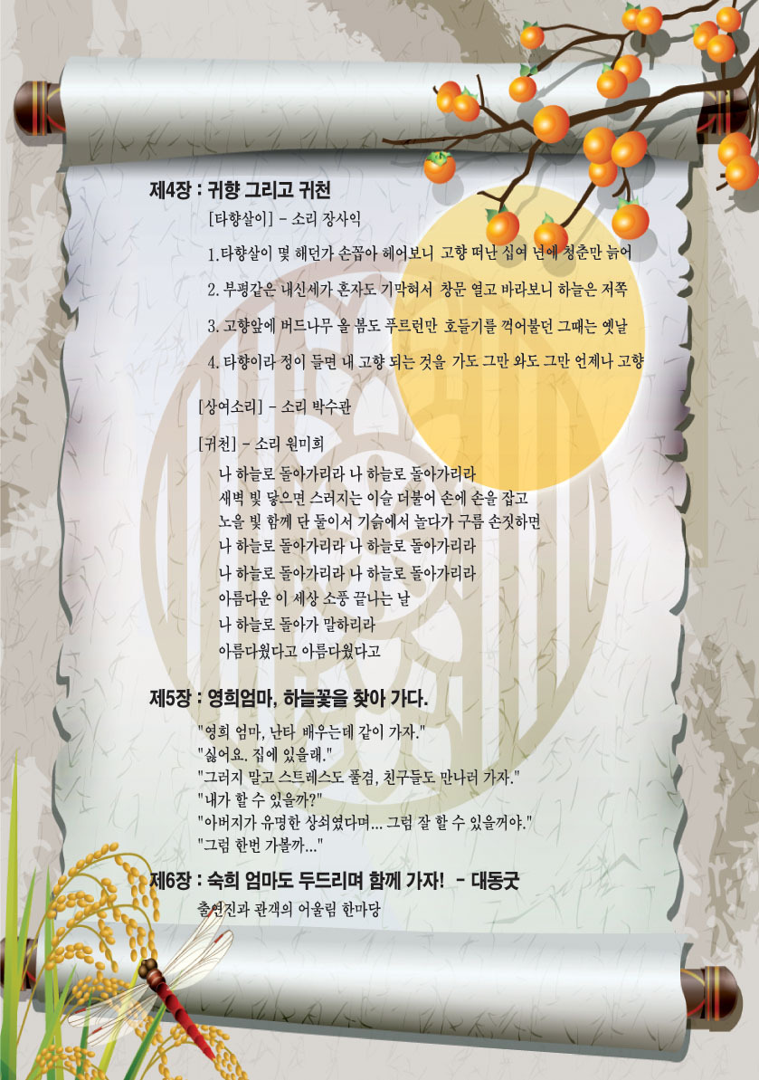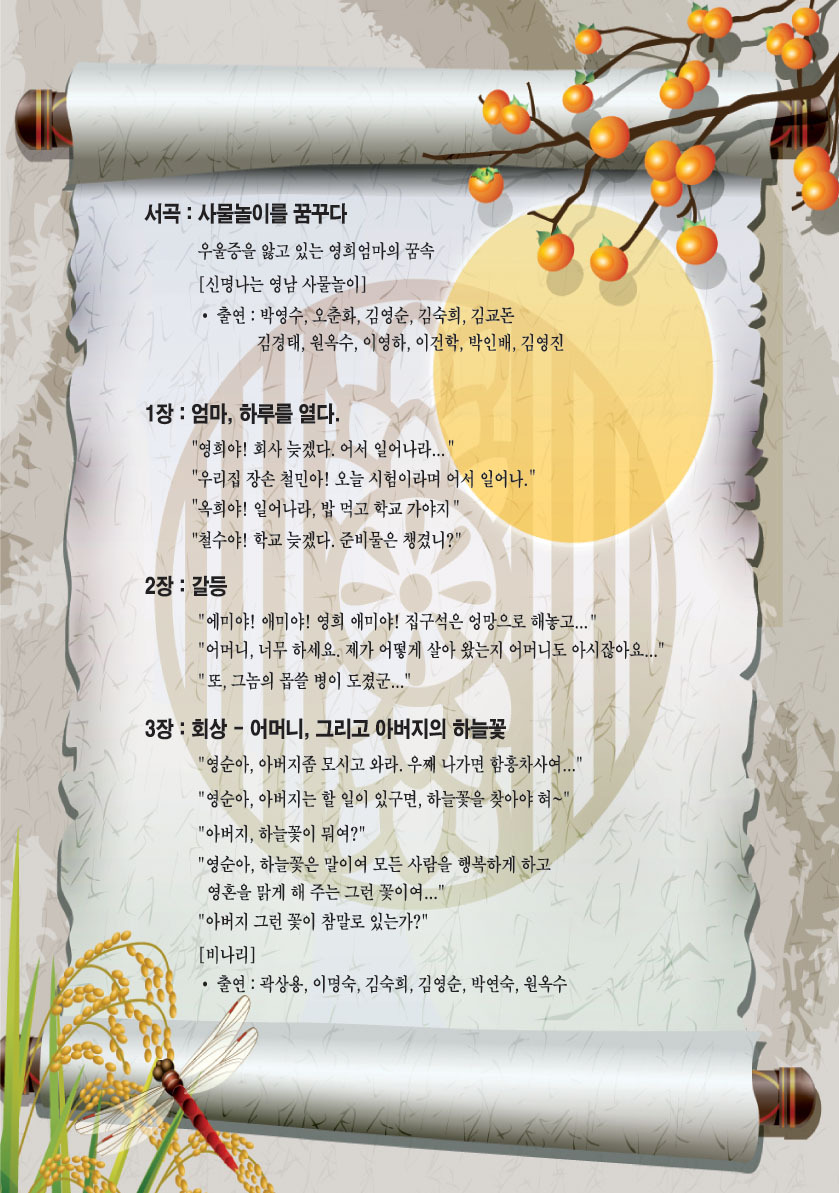 제3장 -회상(보고싶은 어머니 그리운 아버지와 하늘꽃) 영희 엄마의 어린시절을 회상 풍물꾼으로 일생을 사신 친정아버지의 비나리공연과 찾으려던 하늘꽃과 어려운 시절을 사신 어머니