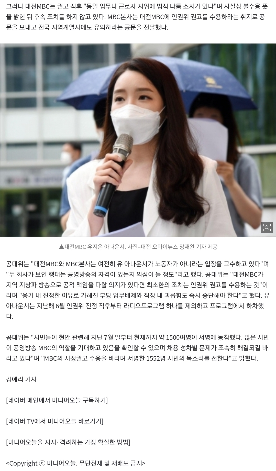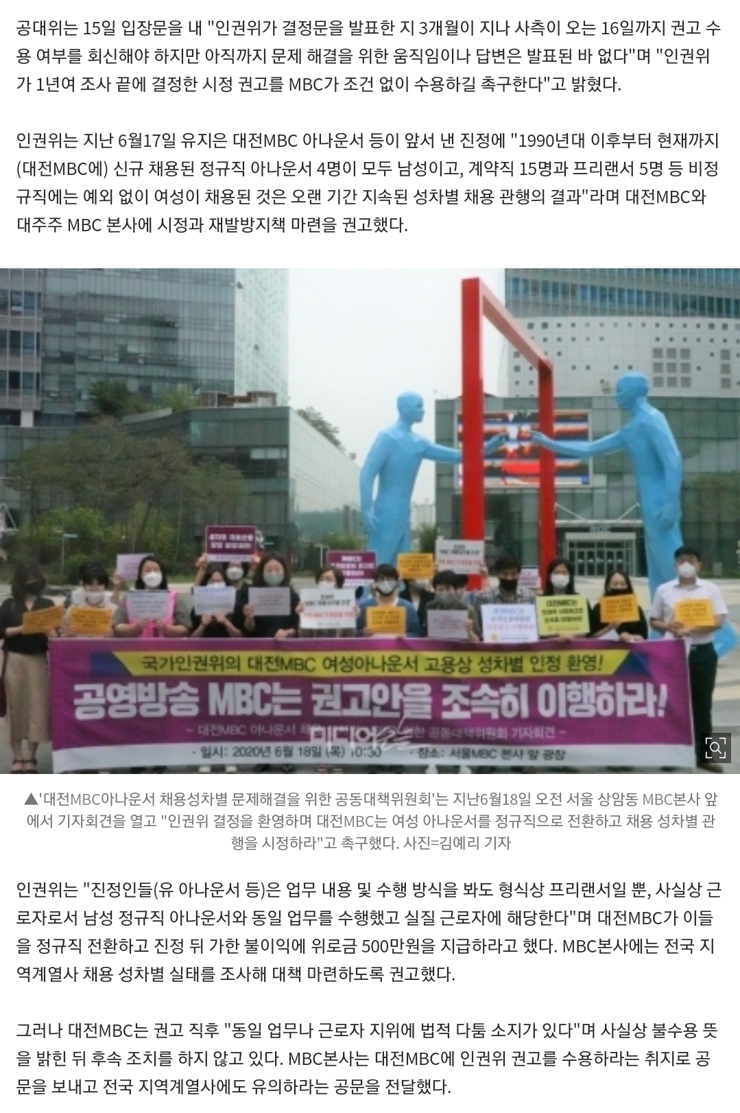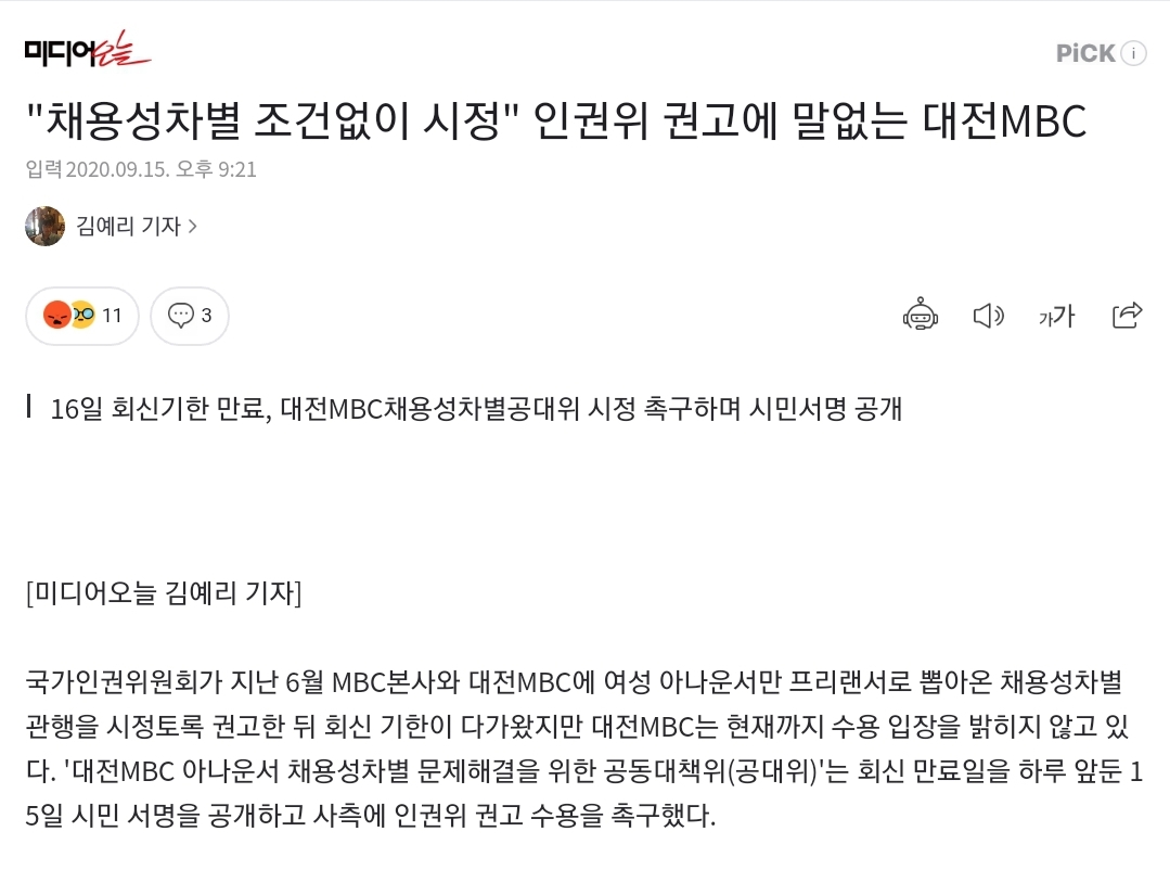 시청자의견 시청자 의견 "채용 성차별 조건없이 시정" 인권위 권고에 말없는 대전MBC 등록일 : 2020-09-16 13:29 조회수 : 164 여러분의 의견을 남겨주세요 ※ 댓글 작성시 상대방에 대한 배려와 책임을 담아 깨끗한 댓글 환경에 동참해 주세요. 0/2000 등록 수정 삭제 이전글 다음글 목록