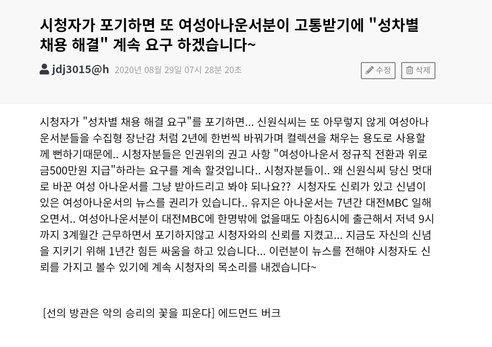 시청자의견 시청자 의견 시청자가 포기하면 또 여성아나운서분이 고통받기에 "성차별 채용 해결" 계속 요구 하겠습니다 등록일 : 2020-09-08 19:05 조회수 : 203 여러분의 의견을 남겨주세요 ※ 댓글 작성시 상대방에 대한 배려와 책임을 담아 깨끗한 댓글 환경에 동참해 주세요. 0/2000 등록 수정 삭제 이전글 다음글 목록