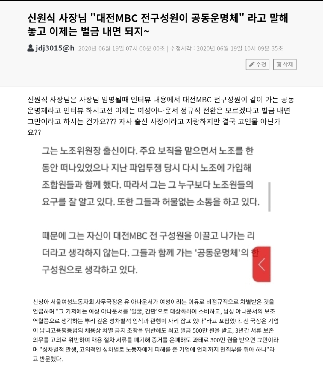 시청자의견 시청자 의견 신원식 사장님 "대전MBC 전구성원이 공동운명체" 라고 말해 놓고 이제는 벌금 내면 되지~ 등록일 : 2020-07-02 14:40 조회수 : 141 여러분의 의견을 남겨주세요 ※ 댓글 작성시 상대방에 대한 배려와 책임을 담아 깨끗한 댓글 환경에 동참해 주세요. 0/2000 등록 수정 삭제 이전글 다음글 목록