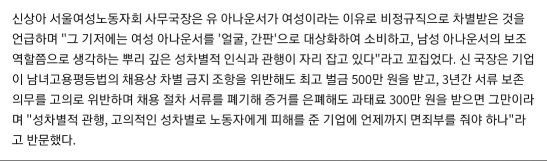 인권위에서 성차별 채용이 맞다는 결정과 두여성 아나운서분의 정규직 전환하라는 권고사항에도.. 신원식씨는 받아드릴수 없다고 하셨는데 법적 구속은 없어도 신원식씨 자신의 도덕적으로 문제가 있는거 아닌가요?? 자신은 정규직이니까 딸. 며느리. 손녀는 평생 비정규직 인생을 살아도 나몰라라~ 이거죠??