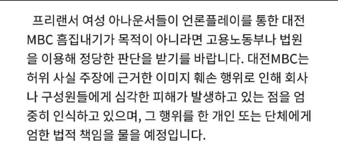 저번에 대전 MBC 입장문 발표한것처럼 시청자 입막음 할려고 어설프게 고소한다고 협박했다가 망신당하지 마시고 인권위 결정을 인정하고~ 유지은 아나운서와 김지원 아나운서의 정규직 전환 이행하세요~ 그게 시청자와 신뢰를 찾는 방법 입니다~~