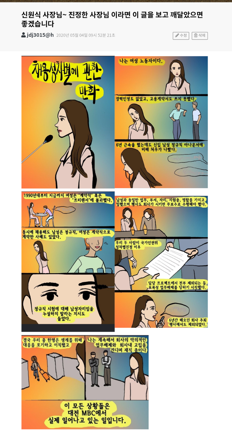 시청자의견 시청자 의견 신원식 사장님~ 진정한 사장님 이라면 이 글을 보고 깨달았으면 좋겠습니다 등록일 : 2020-05-29 17:01 조회수 : 183 여러분의 의견을 남겨주세요 ※ 댓글 작성시 상대방에 대한 배려와 책임을 담아 깨끗한 댓글 환경에 동참해 주세요. 0/2000 등록 수정 삭제 이전글 다음글 목록