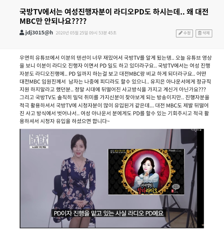 시청자의견 시청자 의견 국방TV에서는 여성진행자분이 라디오PD도 하시는데.. 왜 대전MBC만 안되나요?? 등록일 : 2020-05-29 18:33 조회수 : 218 여러분의 의견을 남겨주세요 ※ 댓글 작성시 상대방에 대한 배려와 책임을 담아 깨끗한 댓글 환경에 동참해 주세요. 0/2000 등록 수정 삭제 이전글 다음글 목록
