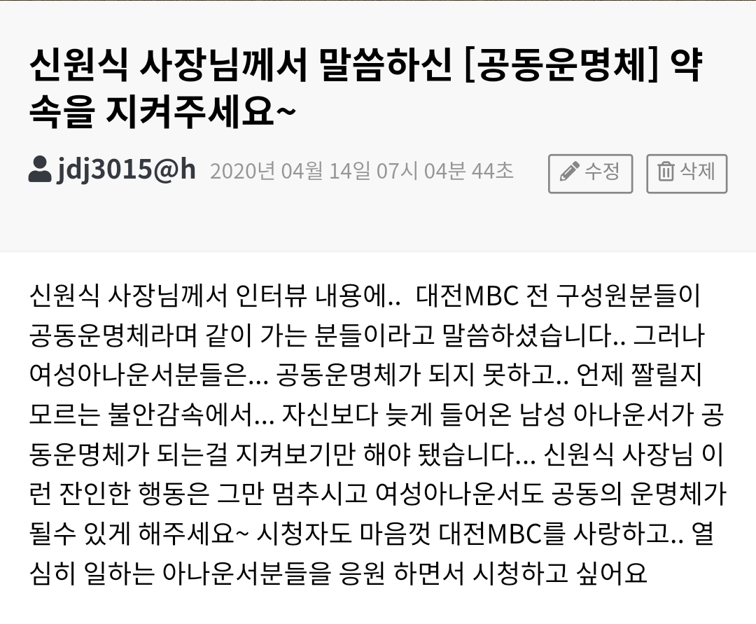 시청자의견 시청자 의견 신원식 사장님께서 말씀하신 [공동운명체] 약속을 지켜주세요~ 등록일 : 2020-04-20 15:58 조회수 : 127 여러분의 의견을 남겨주세요 ※ 댓글 작성시 상대방에 대한 배려와 책임을 담아 깨끗한 댓글 환경에 동참해 주세요. 0/2000 등록 수정 삭제 이전글 다음글 목록