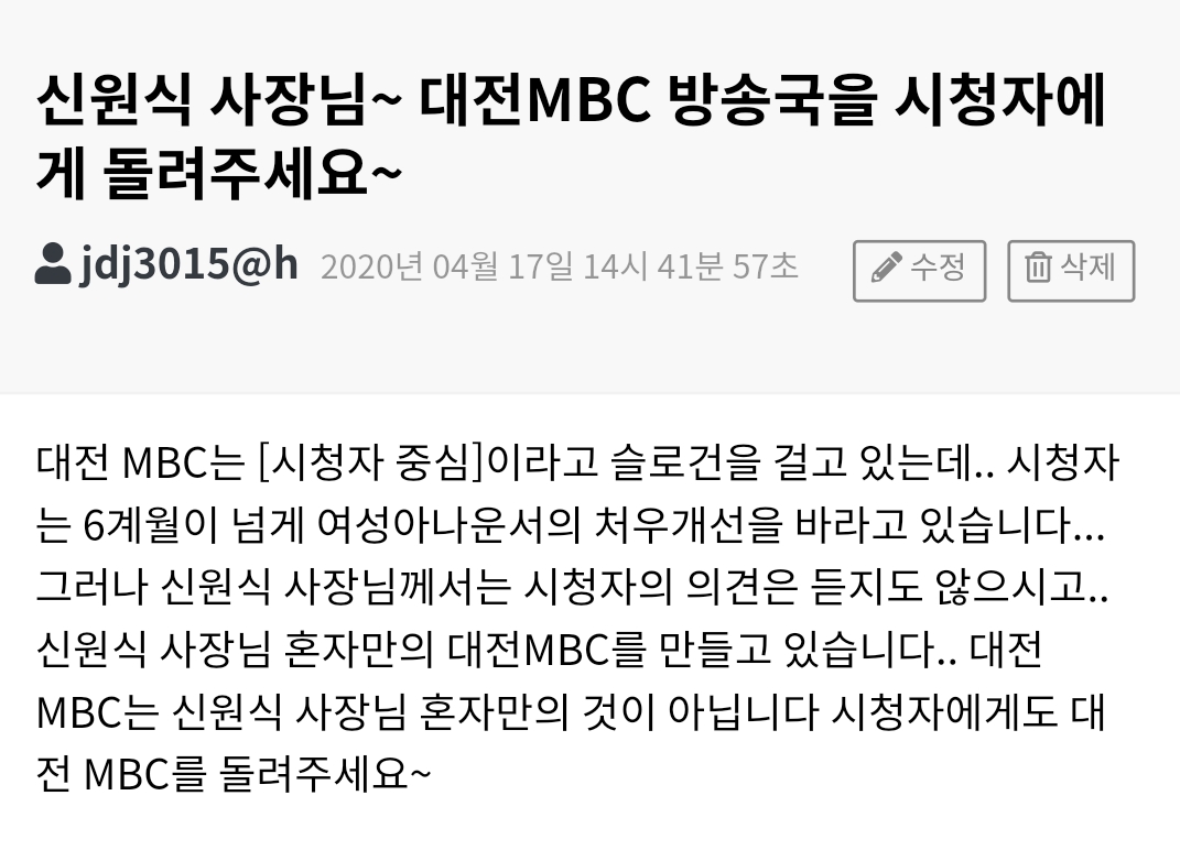 시청자의견 시청자 의견 신원식 사장님~ 대전MBC 방송국을 시청자에게 돌려주세요~ 등록일 : 2020-04-20 16:01 조회수 : 119 여러분의 의견을 남겨주세요 ※ 댓글 작성시 상대방에 대한 배려와 책임을 담아 깨끗한 댓글 환경에 동참해 주세요. 0/2000 등록 수정 삭제 이전글 다음글 목록
