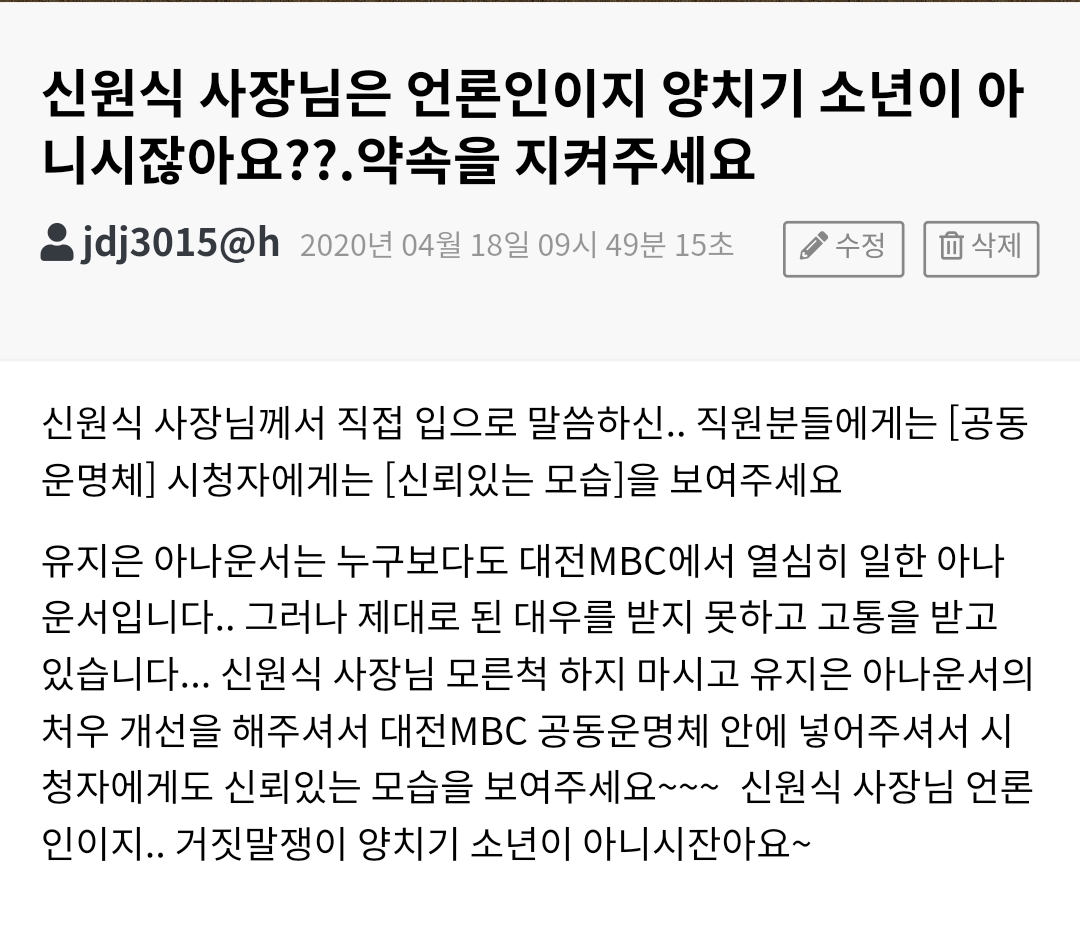 시청자의견 시청자 의견 신원식 사장님은 언론인이지 양치기 소년이 아니시잖아요?? 약속을 지켜주세요 등록일 : 2020-04-20 16:03 조회수 : 111 여러분의 의견을 남겨주세요 ※ 댓글 작성시 상대방에 대한 배려와 책임을 담아 깨끗한 댓글 환경에 동참해 주세요. 0/2000 등록 수정 삭제 이전글 다음글 목록