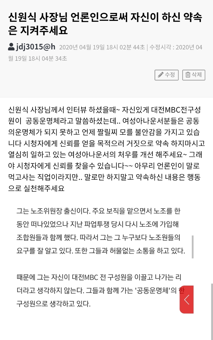 시청자의견 시청자 의견 신원식 사장님 언론인으로써 자신이 하신 약속은 지켜주세요 등록일 : 2020-04-20 16:08 조회수 : 230 여러분의 의견을 남겨주세요 ※ 댓글 작성시 상대방에 대한 배려와 책임을 담아 깨끗한 댓글 환경에 동참해 주세요. 0/2000 등록 수정 삭제 이전글 다음글 목록