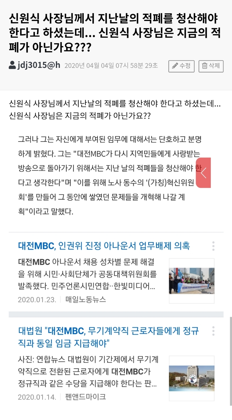 시청자의견 시청자 의견 신원식 사장님께서 지난날의 적폐를 청산해야 한다고 하셨는데... 신원식 사장님은 지금의 적폐가 아닌가요?? 등록일 : 2020-04-20 16:11 조회수 : 155 여러분의 의견을 남겨주세요 ※ 댓글 작성시 상대방에 대한 배려와 책임을 담아 깨끗한 댓글 환경에 동참해 주세요. 0/2000 등록 수정 삭제 이전글 다음글 목록
