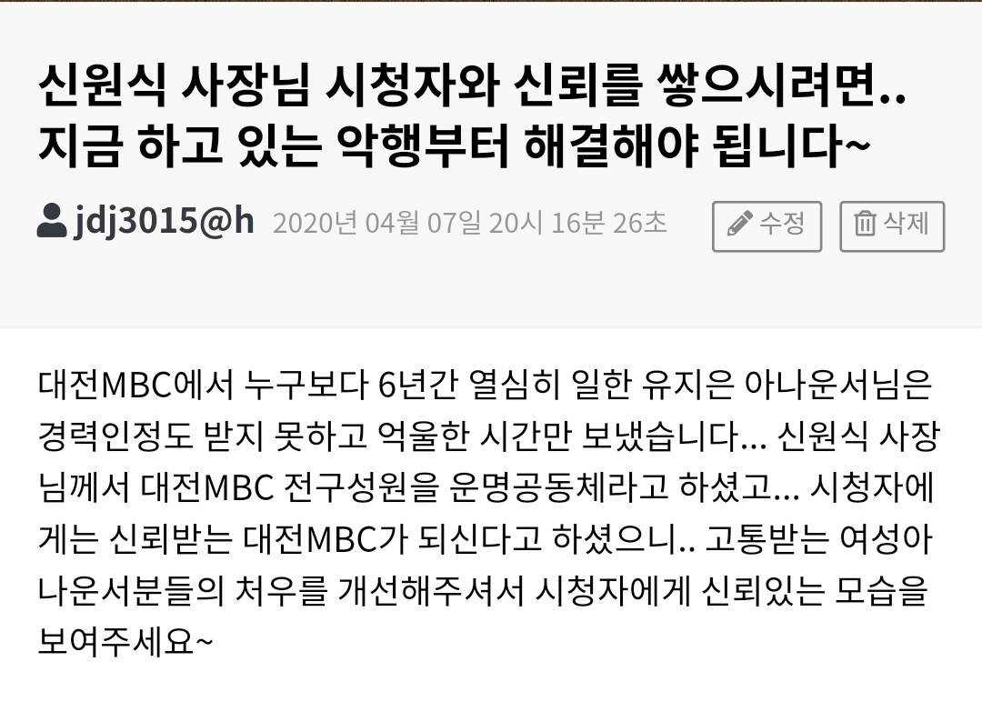 시청자의견 시청자 의견 신원식 사장님 시청자와 신뢰를 쌓으시려면.. 지금 하고 있는 악행부터 해결해야 됩니다~ 등록일 : 2020-04-20 15:53 조회수 : 60 여러분의 의견을 남겨주세요 ※ 댓글 작성시 상대방에 대한 배려와 책임을 담아 깨끗한 댓글 환경에 동참해 주세요. 0/2000 등록 수정 삭제 이전글 다음글 목록